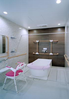 1階は3方介助のバスタブで、車いすの方でも安心して入浴していただけます。